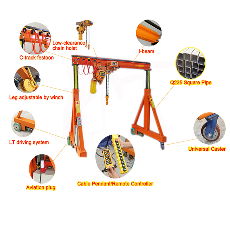 The non-rail gantry crane runs on floor. Capacity can be made up to 20t. In order to make it more useful, we design the leg can be adjustable to meet different roofs.